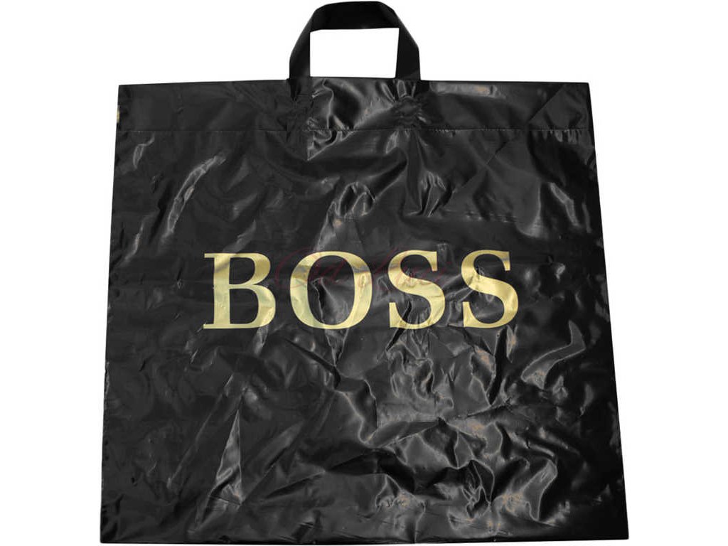 Černá igelitová nákupní taška s uchem, se zlatým nápisem "BOSS", neprůhledná.