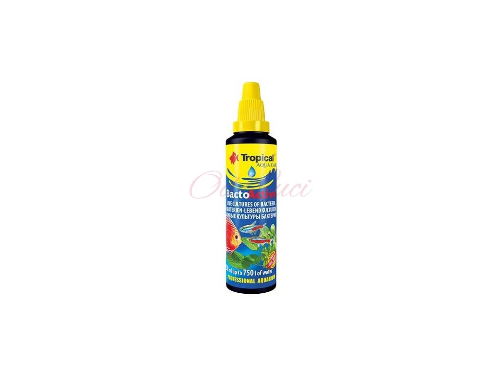 Způsob použití: surovou vodu z vodovodu upravit přípravkem Antychlor nebo Esklarin. Před použitím protřepat! Čerstvě založená akvária – 5ml/75l vody jednou týdně, po 3 týdnech dávkovat jako v zaběhnutých akváriích. Zaběhlá akvária – 5ml/45l vody jednou měsíčně. Slaná voda zpomaluje účinek Tropical BactoActive a proto je nutné použít o 25-50% přípravku více.