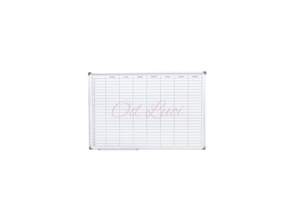 Týdenní plánovací tabule 90x60 cm s kvalitním nátiskem týdenního rastru, lakovaným povrchem a hliníkovým rámem.