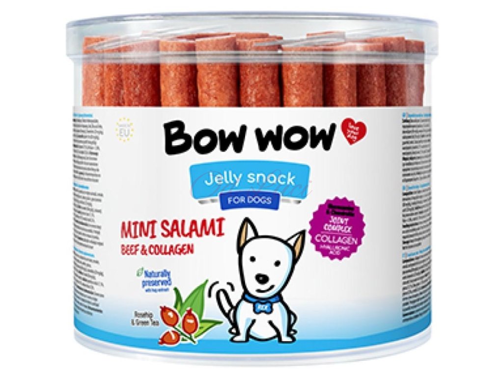 Složení v kg: hovězí kolagen, vedlejší produkty živočišného původu, obiloviny, vedlejší výrobky rostlinného původu, rýže, oleje a tuky, glukosamin 80mg, šípek 80mg, chondroitin 20mg, kyselina hyaluronová 20mg