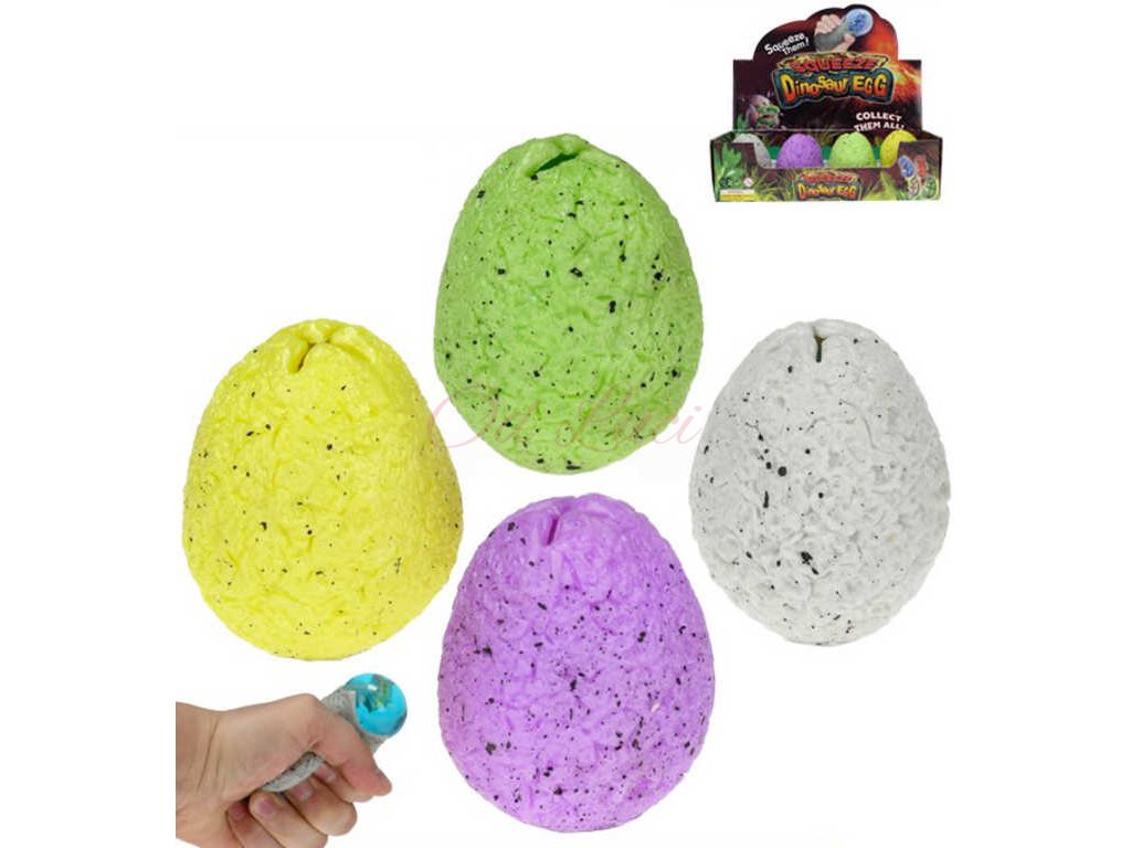 Antistresová plastová hračka, dinosauří vajíčko na mačkání, z měkké, elastické hmoty, s mládětem dinosaura uvnitř, ve čtyřech barevných variantách. Když v ruce hračku zmáčkneš, vejce se otevře a z jeho