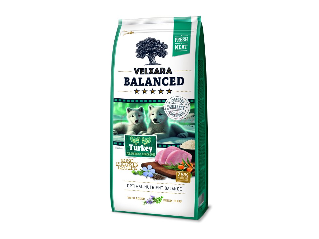 Granule Velxara Puppy jsou určeny pro štěňata a mladé psy jakéhokoliv plemene. Superprémiové krmivo pro psy zajišťuje zvířeti bohatou potravu, které je i pro citlivé psy velmi dobře stravitelné a chutné. Granule s označením GLUTEN-FREE jsou vyrobeny bez lepku (krmiva Balanced obsahují zlomkovou rýži). Označení FRESH MEAT je indikace pro vysoký obsah čerstvého masa. Receptury Balanced jsou monoproteinové - 1 zdroj živočišné bílkoviny. Monoproteinové granule jsou vhodné pro psy s citlivým zažíváním nebo při intoleranci. Díky speciálně uzpůsobené velikosti granulí je krmivo Velxara ideální pro menší i větší plemena. Krmení pro psy Velxara Balanced je vyrobeno v EU, a to ve variantě 750 g a 12 kg.