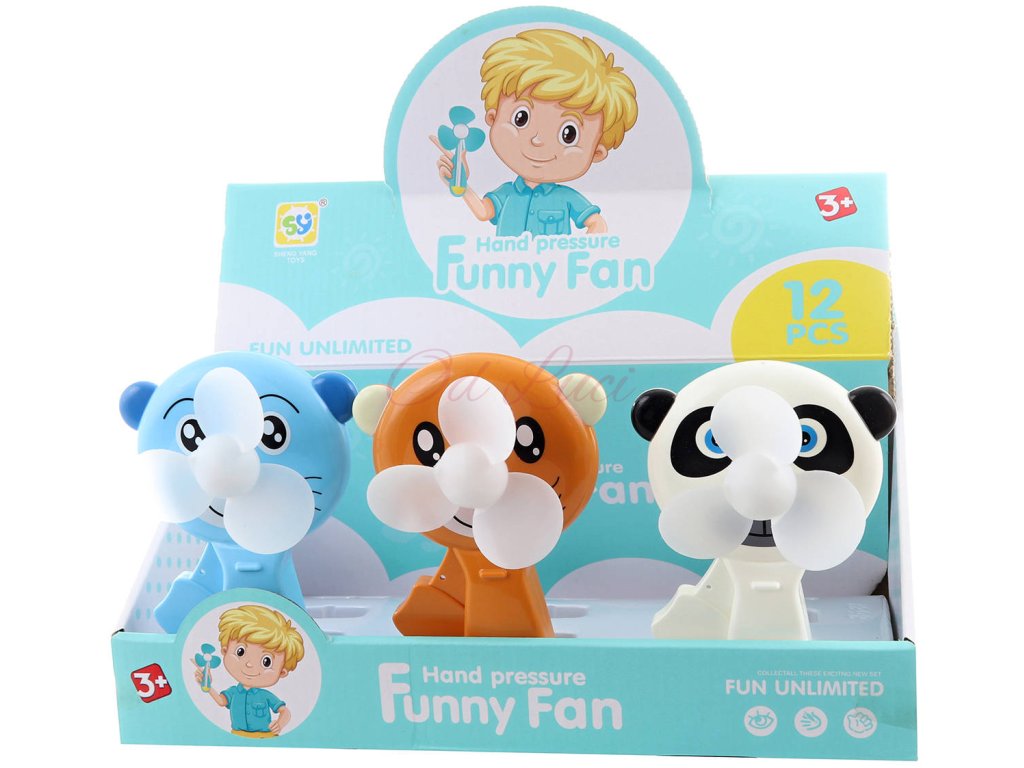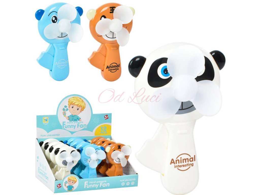 Plastový větráček do ruky. Dětský manuální ruční větrák ve tvaru zvířátka. Ovládání mačkáním páčky. 3 varianty provedení. Velikost 15cm.