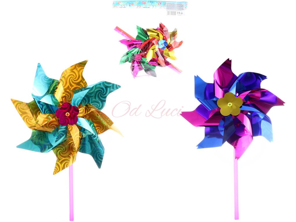 Klasický větrník s pestrobarevnou lesklou růžicí, v několika barevných mixech. Baleno po 2 kusech. Plastová tyčka.
