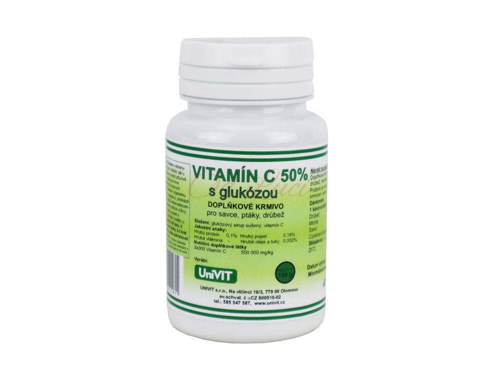 Doplňkové krmivo pro savce, ptáky, drůbež. Vodorozpustný vitamín C s glukózou, lze podávat v sypkém krmivu nebo v pitné vodě.