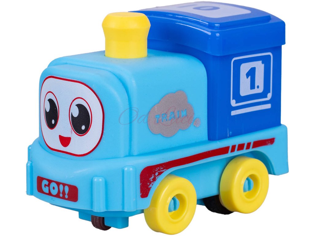 Baby barevný vláček - lehká plastová mašinka, lokomotiva s očima, s pohonem na setrvačník, pro nejmenší děti, pro miminko. Velikost 9cm. 4 barevné varianty.