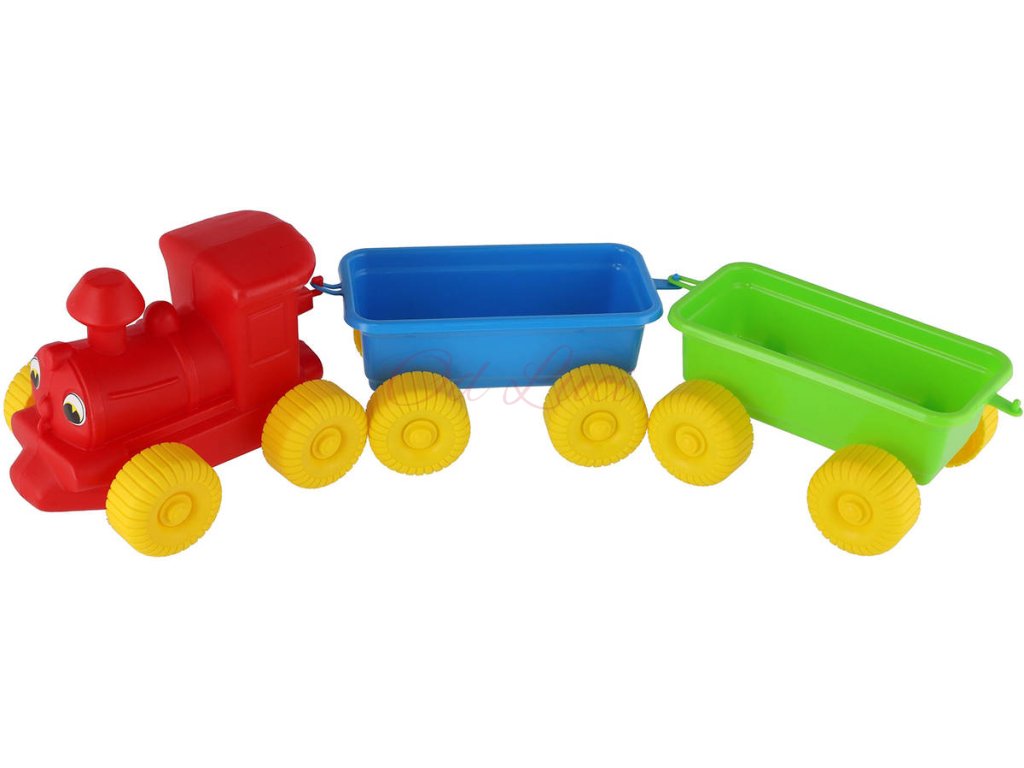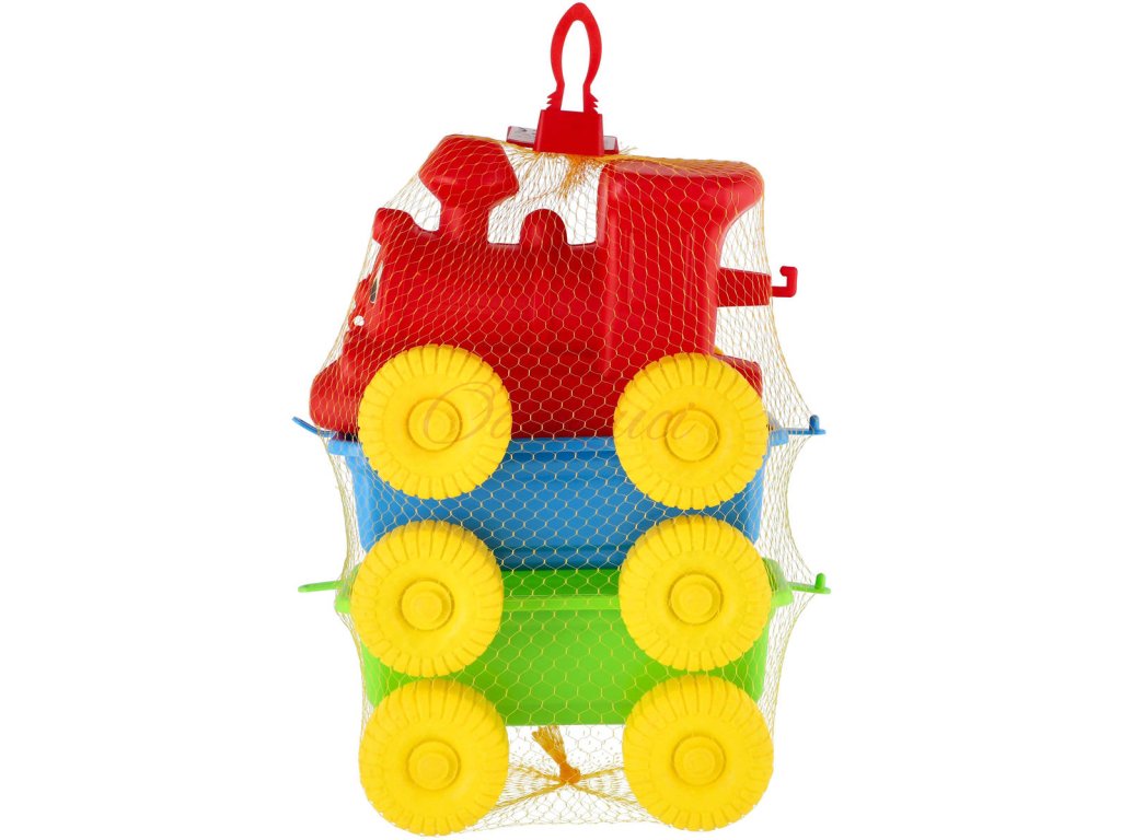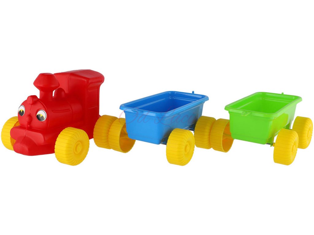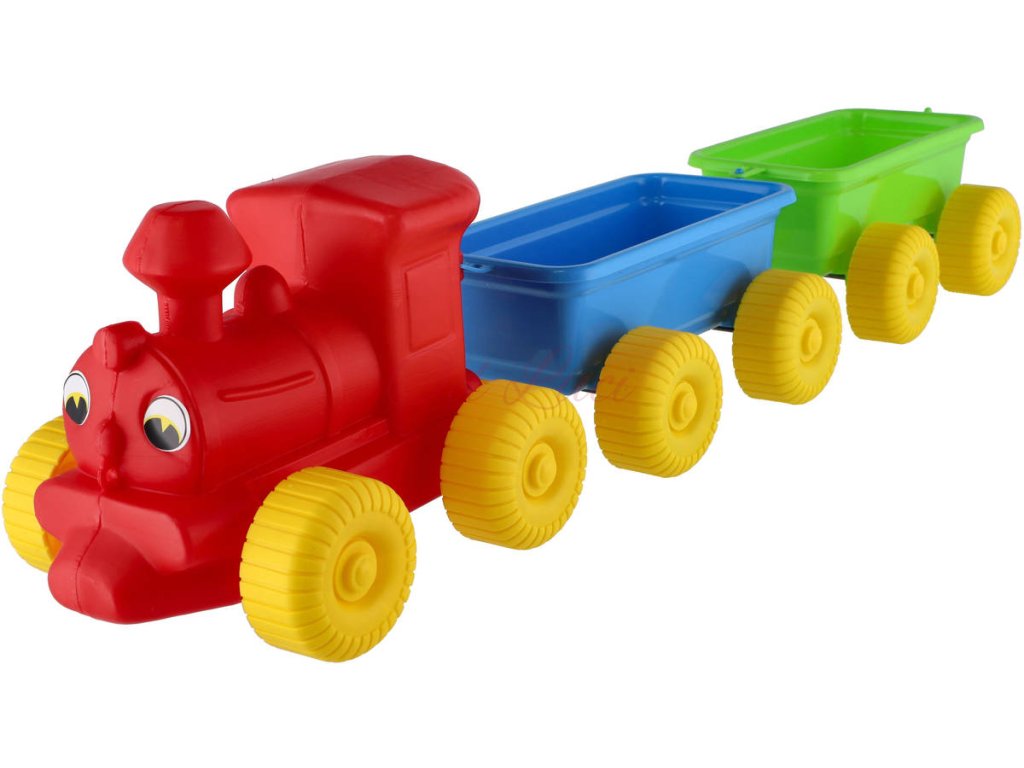 Barevný nákladní plastový vláček pro nejmenší děti, na písek. Součástí mašinka s očima a 2 vagonky. Celková délka vlaku: 60cm.