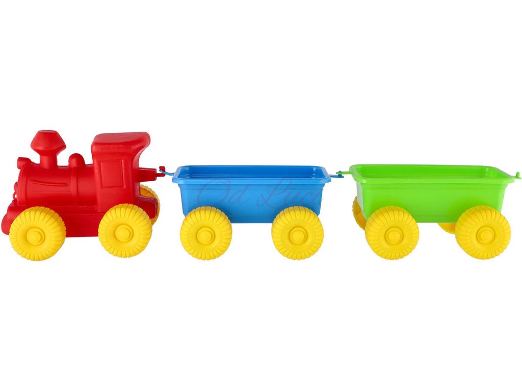 Vlak se 2 vagónky o celkové délce 60cm. Vhodný i na písek, pro nejmenší děti. Které dítě by rádo nepozorovalo vlaky? Pořiďte mu nějaký vláček domů, určitě si bude spokojeně houkat.