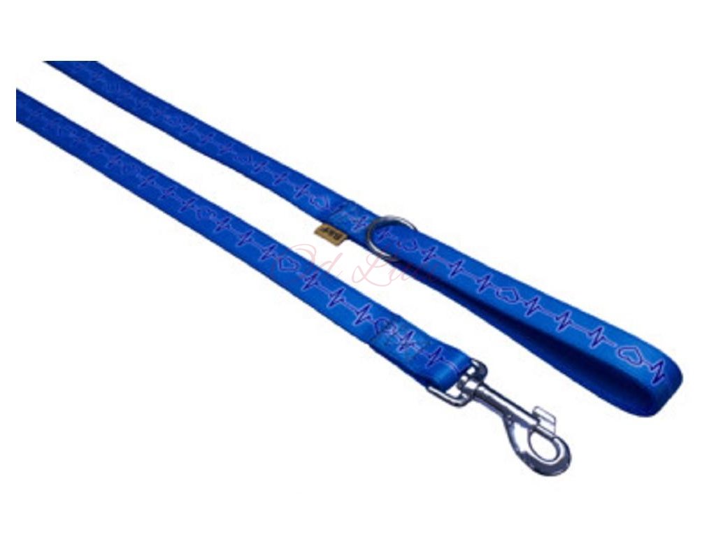 Vodítko z měkkého popruhu s motivem EKG. Vodítko je pevně prošité, v uchu všitý svařovaný kroužek pro zkrácení na polovinu.