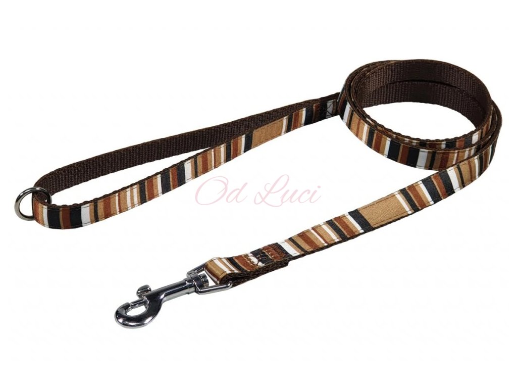 Vodítko je vyrobeno z měkkého popruhu v s motivem proužků, je pevně prošito, v uchu je všitý svařovaný kroužek pro zkrácení na polovinu a přehození přes tělo.