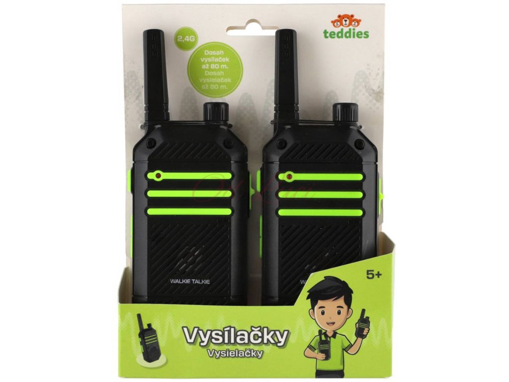 Teddies černé plastové dětské 2,4GHz vysílačky Walkie-Talkie s dosahem až 80 metrů. Balení po 2ks. Hračka na baterie.