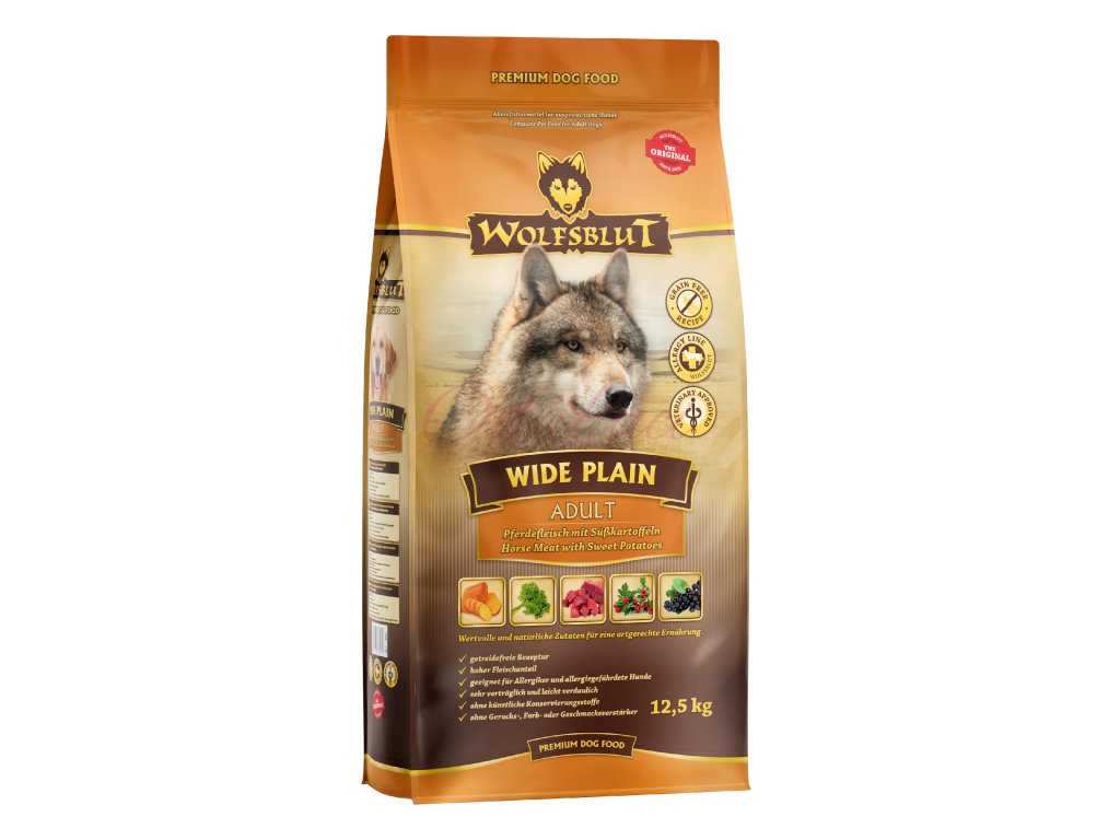 Vlci loví svou kořist od Skalistých hor Severní Ameriky, arktické tundry, hor a lesů Evropy až po pouště a stepi střední Asie. To jim dodává maso a vnitřnosti bohaté na živiny, ale také zeleninu, ovoce, bobule, kořeny a bylinky z obsahu žaludku kořisti. Obilí zde není zahrnuto. Vlk tak přijímá potřebné vitamíny, minerály, stopové prvky, enzymy a druhotné rostlinné látky. Vzhledem k tomu, že vlk je předkem všech psů, naše suché krmivo pro psy Wolfsblut je založeno na přirozených stravovacích návycích vlka. Obsahuje hodně masa v kombinaci se superpotravinami, které obsahují hodnotné ingredience – stejně jako v přírodě, bez jakýchkoliv obilovin. Náš výběr výjimečných druhů masa a superpotravin bohatých na živiny vychází z vlčích biotopů a jejich pestré stravy. Wolfsblut nabízí každému psovi druhově vhodnou a originální stravu a díky rozmanitosti odrůd si každý najde něco, co snese. Tato receptura byla vyvinuta ve spolupráci s veterináři a je založena na přirozeném vzoru vlčí kořisti. S bohatými sladkými bramborami jako bezlepkovým zdrojem sacharidů je váš pes také vybaven cennou vlákninou a beta-karotenem.