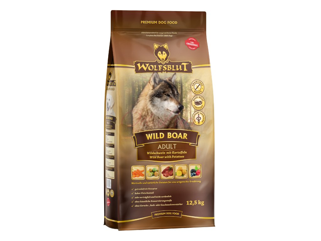 Vlci loví svou kořist od Skalistých hor Severní Ameriky, arktické tundry, hor a lesů Evropy až po pouště a stepi střední Asie. To jim dodává maso a vnitřnosti bohaté na živiny, ale také zeleninu, ovoce, bobule, kořeny a bylinky z obsahu žaludku kořisti. Obilí zde není zahrnuto. Vlk tak přijímá potřebné vitamíny, minerály, stopové prvky, enzymy a druhotné rostlinné látky. Vzhledem k tomu, že vlk je předkem všech psů, naše suché krmivo pro psy Wolfsblut je založeno na přirozených stravovacích návycích vlka. Obsahuje hodně masa nebo ryb v kombinaci se superpotravinami, které obsahují hodnotné ingredience – stejně jako v přírodě, bez obilovin. Náš výběr výjimečných druhů masa a superpotravin bohatých na živiny vychází z vlčích biotopů a jejich pestré stravy. Wolfsblut nabízí každému psovi druhově vhodnou a originální stravu a díky rozmanitosti odrůd si každý najde něco, co snese. Receptura na suché krmivo WILD BOAR ADULT kombinuje výživu vlků s nejnovějšími vědeckými poznatky o správné výživě psů.
