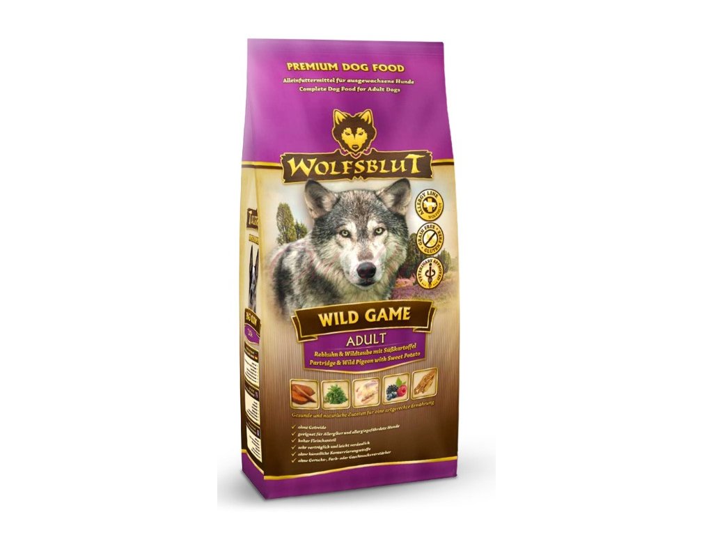 Vlci loví svou kořist od Skalistých hor Severní Ameriky, arktické tundry, hor a lesů Evropy až po pouště a stepi střední Asie. To jim dodává maso a vnitřnosti bohaté na živiny, ale také zeleninu, ovoce, bobule, kořeny a bylinky z obsahu žaludku kořisti. Obilí zde není zahrnuto. Vlk tak přijímá potřebné vitamíny, minerály, stopové prvky, enzymy a druhotné rostlinné látky. Vzhledem k tomu, že vlk je předkem všech psů, naše mokré krmivo Wolfsblut je založeno na přirozených stravovacích návycích vlka. Obsahuje hodně masa nebo ryb v kombinaci se superpotravinami, které obsahují hodnotné ingredience – stejně jako v přírodě, bez obilovin. Náš výběr výjimečných druhů masa a superpotravin bohatých na živiny vychází z vlčích biotopů a jejich pestré stravy. Wolfsblut nabízí každému psovi druhově vhodnou a originální stravu a díky rozmanitosti odrůd si každý najde něco, co snese. Receptura na suché krmivo WILD GAME kombinuje výživu vlků s nejnovějšími vědeckými poznatky o správné výživě psů.