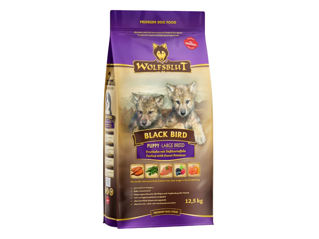 Vlci loví svou kořist od Skalistých hor Severní Ameriky, arktické tundry, hor a lesů Evropy až po pouště a stepi střední Asie. To jim dodává maso a vnitřnosti bohaté na živiny, ale také zeleninu, ovoce, bobule, kořeny a bylinky z obsahu žaludku kořisti. Obilí zde není zahrnuto. Vlk tak přijímá potřebné vitamíny, minerály, stopové prvky, enzymy a druhotné rostlinné látky. Vzhledem k tomu, že vlk je předkem všech psů, naše suché krmivo pro psy Wolfsblut je založeno na přirozených stravovacích návycích vlka. Obsahuje hodně masa nebo ryb v kombinaci se superpotravinami, které obsahují hodnotné ingredience – stejně jako v přírodě, bez obilovin. Náš výběr výjimečných druhů masa a superpotravin bohatých na živiny vychází z vlčích biotopů a jejich pestré stravy. Wolfsblut nabízí každému psovi druhově vhodnou a originální stravu a díky rozmanitosti odrůd si každý najde něco, co snese. Receptura suchého krmiva BLACK BIRD Puppy Large Breed kombinuje výživu vlků s nejnovějšími vědeckými poznatky o správné výživě psů.