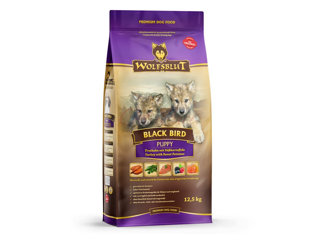 Vlci loví svou kořist ve Skalistých horách Severní Ameriky, arktické tundře, horách a lesích Evropy a dokonce i v pouštích a stepích Střední Asie. Ty jim z obsahu žaludku kořisti poskytují maso a na živiny bohaté vnitřnosti, stejně jako zeleninu, ovoce, bobule, kořeny a byliny. Obiloviny zde nejsou zahrnuty. Takto vlk získává vitamíny, minerály, stopové prvky, enzymy a druhotné rostlinné látky, které potřebuje. Vzhledem k tomu, že vlk je předkem všech psů, je naše suché krmivo pro psy Wolfsblut založeno na přirozených stravovacích návycích vlka. Obsahuje dostatek masa nebo ryb v kombinaci se superpotravinami, které obsahují cenné ingredience – stejně jako v přírodě, ale bez obilovin. Náš výběr výjimečného masa a superpotravin bohatých na živiny je založen na vlčím prostředí a jeho rozmanité stravě. Wolfsblut nabízí každému psovi druhově vhodnou a přirozenou stravu a díky široké škále druhů si každý pes najde to, co snese. Receptura suchého krmiva BLACK BIRD PUPPY kombinuje stravu vlka s nejnovějšími vědeckými poznatky o správné výživě psů.