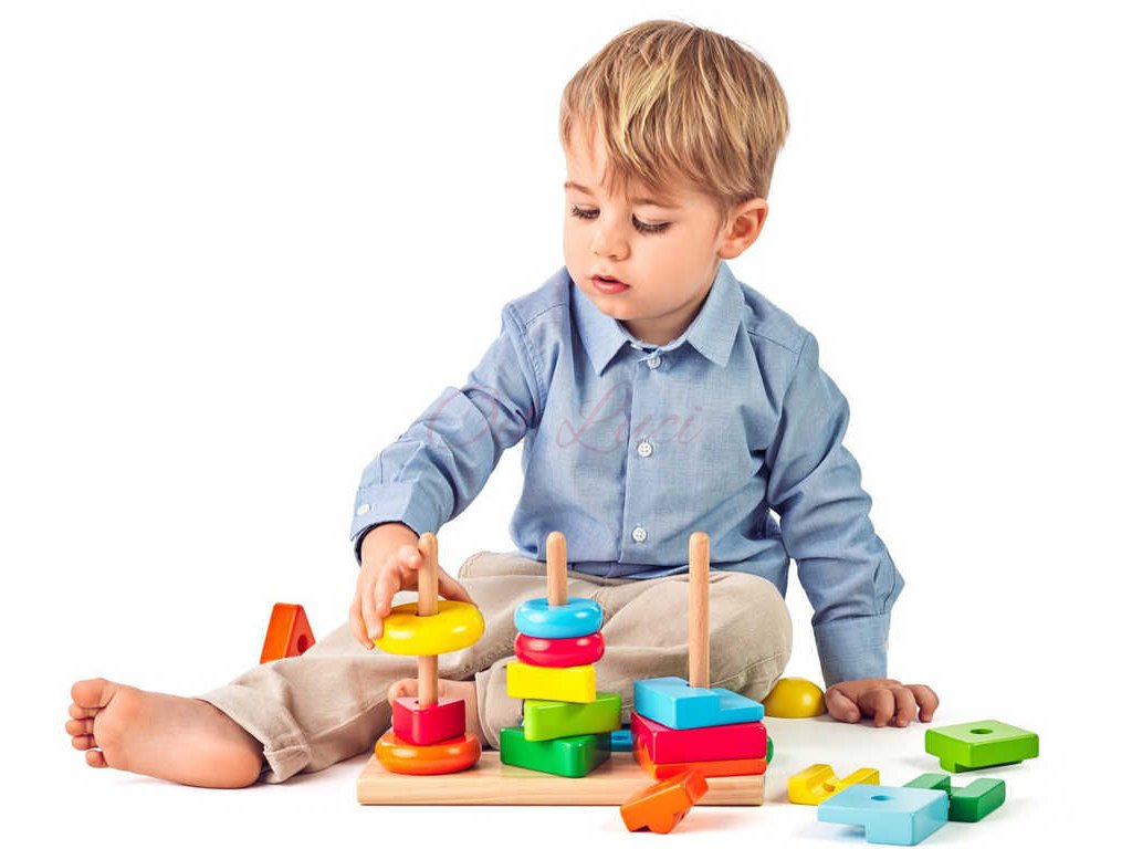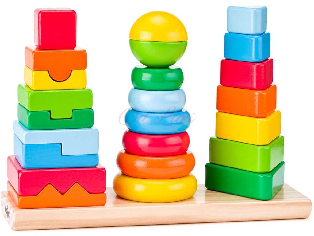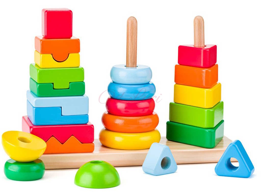 Set tří barevných skládacích věží jsou výbornou didaktickou hračkou pro děti, kterým umožňuje procvičovat vnímání barev, tvarů a velikostí. Oproti běžným skládacím věžím, které obsahují jen jednu věž, má tato