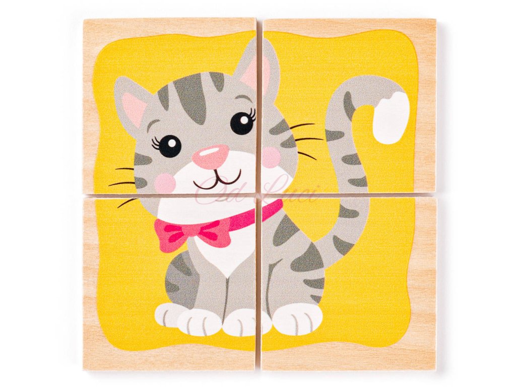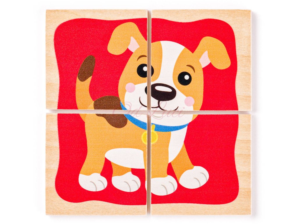 Sada čtyř dřevěných dětských skládaček s domácími zvířátky. Úkolem dítěte je sestavit obrázek rozdělený do 4 kusů tak, aby odpovídal skutečnosti. A když hraní skončí, jednoduše dílky uklidíte do praktické dřevěné krabičky s víkem. V balení naleznete celkem 4 obrázky o 4 dílcích. Čtyřdílné obrázky jsou ideální pro první skládání, rozvíjí motoriku i představivost.