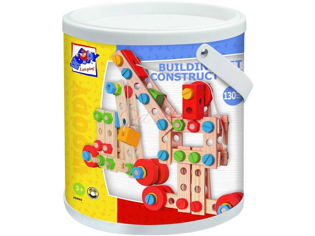 Stavebnice Woody Montážní stavebnice Constructor obsahuje 130 dílů. Montážní kostky a spojky jsou vyrobeny ze dřeva, šroubky a kolečka jsou z kvalitního pevného plastu.