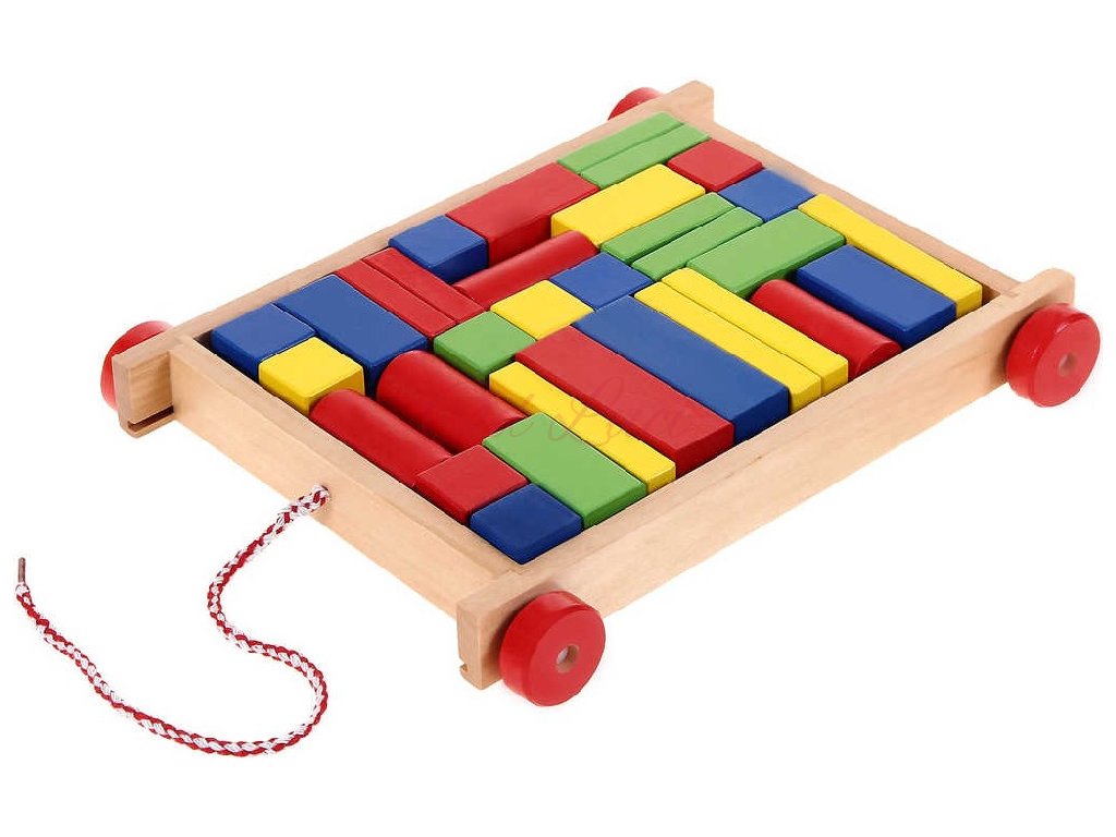Vozík obsahuje 34 dílů barevných dřevěných kostek různých tvarů a velikostí.Hračka je kombinaci tahací hračky a stavebnice.