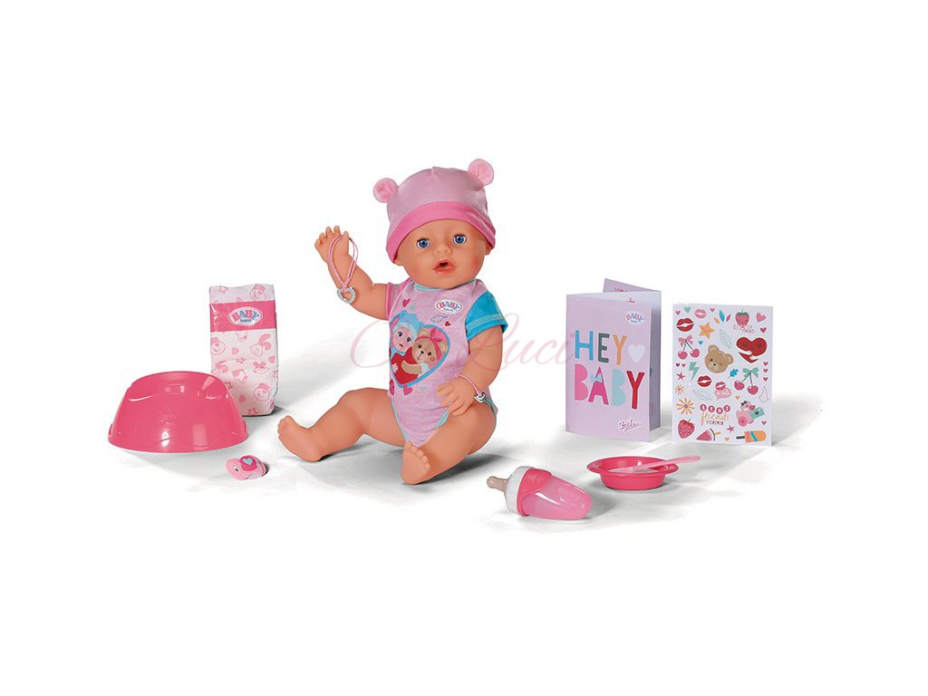 Zapf Baby Born panenka miminko Emma s funkcemi, velikost 43cm, pije, čůrá, pláče, součástí 10 doplňků-