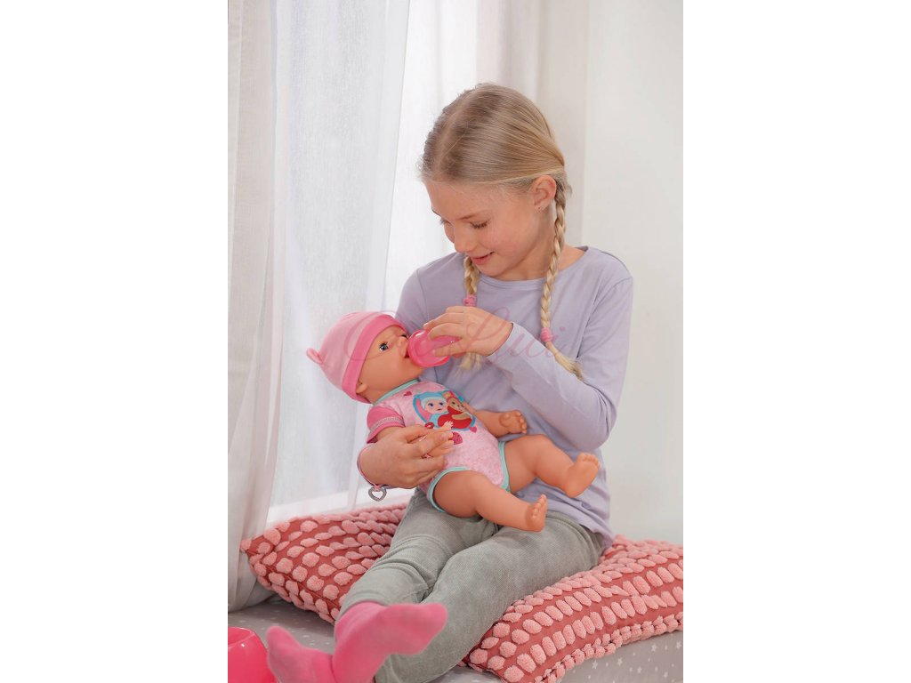 Představujeme Emmu! Panenku Emmu v novém oblečku a s 10 doplňky. Přináší si s sebou i kouzelný talířek: když do talířku s bílou destičkou uvnitř dáte trochu vody, objeví se na destičce lahodné jídlo s roztomilým obličejem, které z krmení panenky udělá ještě větší zábavu. Když Emmu po nakrmení (vodou) nebo po napití vody z lahvičky posadíte na nočník a zmáčknete jí bříško, objeví se na destičce v nočníku obrázek čůrání a kakání. Když se Emma napije vody z lahvičky, může ronit slzy a je třeba ji utišit. Pomoci může třeba kouzelný dudlík: když ho v pusince otočíte o 180 stupňů, očička se jí buď otevřou nebo zavřou. Otočte ještě jednou a stane se opak. Emma ale dokáže ještě víc: má pohyblivé klouby a můžete ji vzít i do vany. Nyní dokonce uschne rychleji, než kdy dříve: abyste panenku po hraní dobře vyčistili, je k tomu možné odejmout jednu nohu a vytvořit tím větší otvor pro čištění panenky. Voda tak z panenky snadněji odteče. Pro ještě zajímavější hru si Emma do svého nového domova kromě lahvičky, dudlíku, talířku s destičkou s obrázkem jídla a nočníku s destičkou s obrázkem čůrání a kakání přináší také plenku, rodný list, arch samolepek a dva náramky přátelství – jeden pro panenku a jeden pro její malou maminku – na důkaz dlouhého a láskyplného kamarádství mezi dítětem a panenkou.
