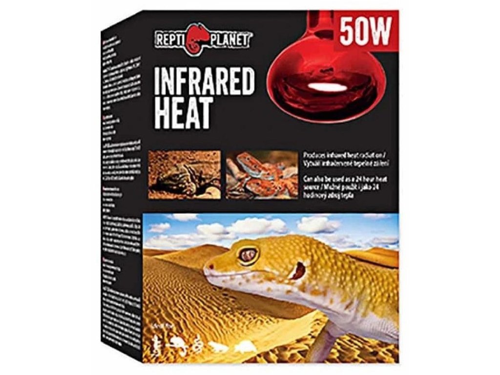 Repti Planet Infrared HEAT 50W je výkonná žárovka s infračerveným zářením ideální k celodennímu i nočnímu výhřevu terárií. Poskytuje plošné sálavé teplo bez rušivého viditelného světla, takže nenarušuje přirozený denní a noční cyklus zvířat. Je ideální pro menší terária s druhy vyžadujícími stabilní tepelné podmínky i během noci, jako jsou pagekoni, žáby, pavouci nebo mladí hadi. Zvyšuje vnitřní teplotu terária. Červené světlo nenarušuje přirozený denní a noční cyklus. Vytváří infračervené tepelné záření. Možné použít i jako 24 hodinový zdroj tepla. Ideální pro noční pozorování.