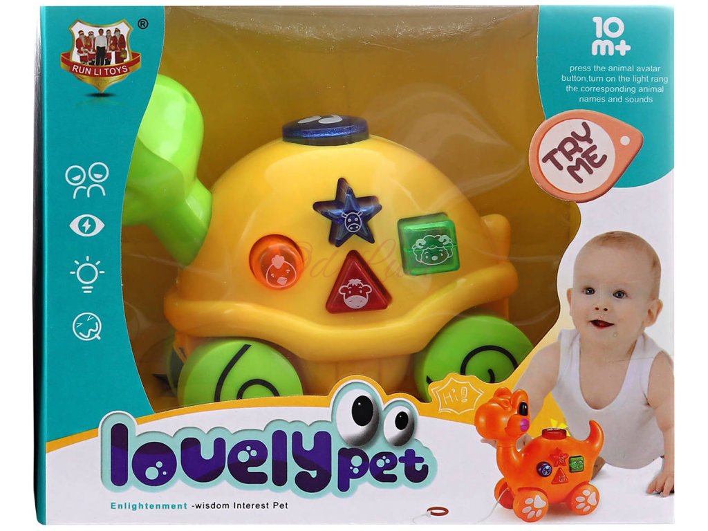 Tahací veselá želvička na kolečkách, o velikosti 15cm, pro nejmenší děti. Želva hraje melodie a zvuky zvířátek. Hračka na baterie, se světlem a zvukem. 2 barevné varianty.